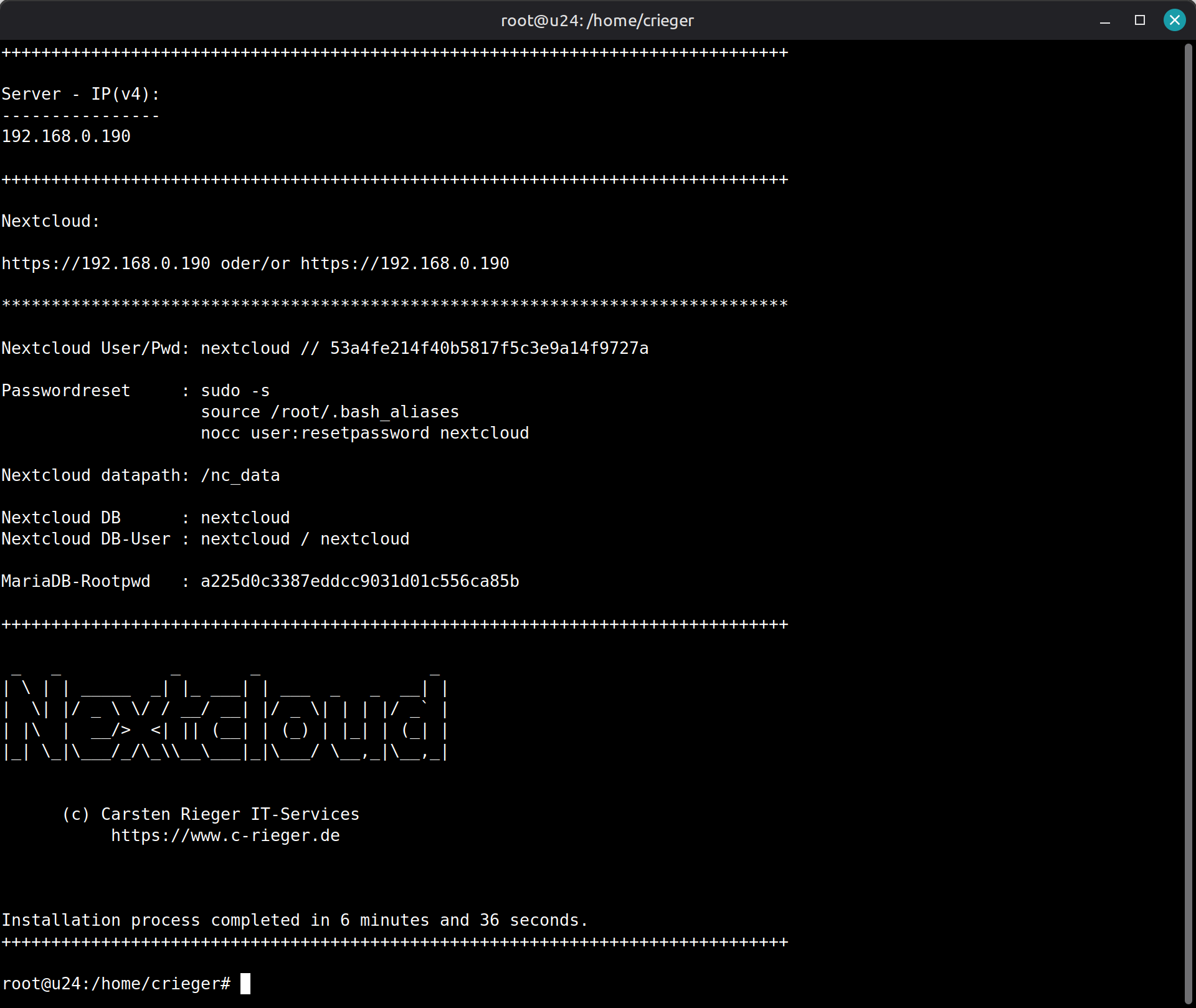 Abschließend empfehlen wir, sowohl das angepasste Skript, als auch das […]/Nextcloud-Installationsskript/install.log zu entfernen.