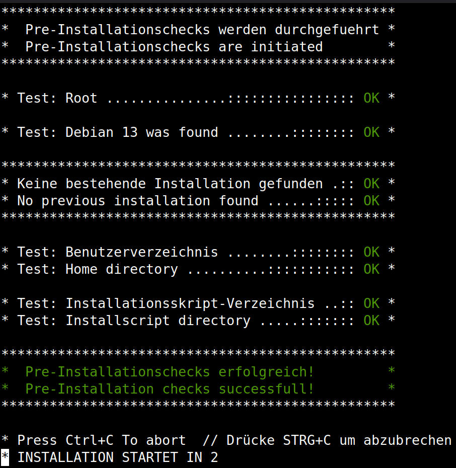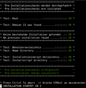 Das Skript überprüft zu Beginn alle notwendigen Voraussetzungen und beginnt nach 10 Sekunden automatisch mit der Installation: