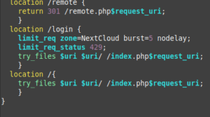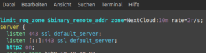 limit_req_zone $binary_remote_addr zone=NextCloud:10m rate=2r/s;