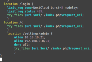tail -f /var/log/nginx/access.log | grep 429Um einen Bereich der Nextcloud (bspw. die Administrationseinstellungen) für bestimmte IP’s zu sperren oder bspw. nur für interne IP’s zugänglich zu machen, nutzen Sie diesen exemplarischen ‚location‘-Block: