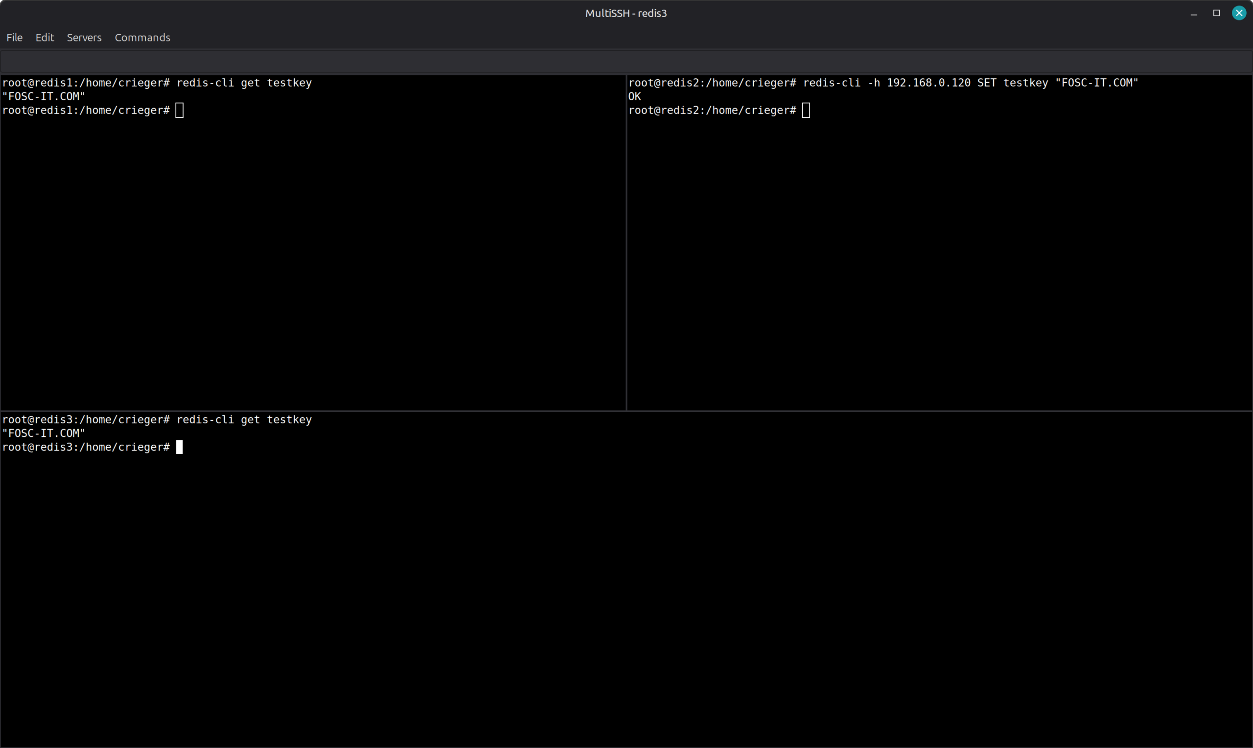 Erstellen Sie einen Redis-Key namens „testkey“, der den Wert „FOSC-IT.COM“ erhält. Diesen Redis-Key lassen wir uns an den anderen Redis-Nodes #2 und #3 (Slaves) anzeigen:
